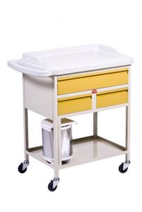 Transport and storage trolley is designed for short-transporting materials, medical accessories, such as instruments, surgical gloves, medicines and dressing materials. Trolley also contains place for hanging waste bag.